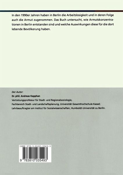 In den 1990er Jahren haben in Berlin die Arbeitslosigkeit und in deren Folge auch die Armut zugenommen. Das Buch untersucht, wie Armutskonzentrationen in Berlin entstanden sind und welche Auswirkungen diese für die dort lebende Bevölkerung haben.