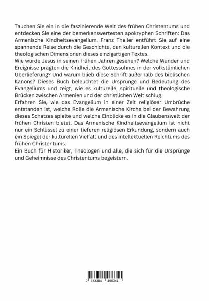 Tauchen Sie ein in die faszinierende Welt des frühen Christentums und entdecken Sie eine der bemerkenswertesten apokryphen Schriften: Das Armenische Kindheitsevangelium. Franz Theiler entführt Sie auf eine spannende Reise durch die Geschichte, den kulturellen Kontext und die theologischen Dimensionen dieses einzigartigen Textes.Wie wurde Jesus in seinen frühen Jahren gesehen? Welche Wunder und Ereignisse prägten die Kindheit des Gottessohnes in der volkstümlichen Überlieferung? Und warum blieb diese Schrift außerhalb des biblischen Kanons? Dieses Buch beleuchtet die Ursprünge und Bedeutung des Evangeliums und zeigt, wie es kulturelle, spirituelle und theologische Brücken zwischen Armenien und der christlichen Welt schlug.Erfahren Sie, wie das Evangelium in einer Zeit religiöser Umbrüche entstanden ist, welche Rolle die Armenische Kirche bei der Bewahrung dieses Schatzes spielte und welche Einblicke es in die Glaubenswelt der frühen Christen bietet. Das Armenische Kindheitsevangelium ist nicht nur ein Schlüssel zu einer tieferen religiösen Erkundung, sondern auch ein Spiegel der kulturellen Vielfalt und des intellektuellen Reichtums des frühen Christentums.Ein Buch für Historiker, Theologen und alle, die sich für die Ursprünge und Geheimnisse des Christentums begeistern.