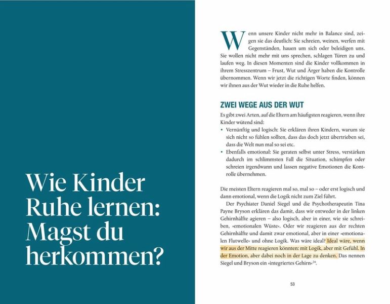 Nach den ausführlichen Gesprächsgrundlagen werden nacheinander zehn wichtige Themen sehr übersichtlich und gut verständlich behandelt. Die Autorin bietet zahlreiche Fallbeispiele und konkrete Reaktionsvorschläge für verschiedene Situationen. Besonders hilfreich sind die direkt anwendbaren Techniken wie Spiegeln, Empathie zeigen und gemeinsames Entscheidungen treffen. Das Buch bringt Kinder auf Augenhöhe mit Erwachsenen und lehrt Eltern, hinter die Worte zu hören.