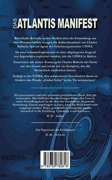 Rätselhafte Berichte in den Medien über die Ermordung von drei Wissenschaftler, erregen die Aufmerksamkeit von Charles Roberts, Special Agent der Geheimorganisation CISMA. Als zwei seltsameExplosionen in einer abgelegenen Gegend von Argentinien registriert werden, tritt die CISMA in Aktion. Zusammen mit seinen Teams, geht Charles Roberts der Sache auf den Grund und stösst auf ein Komplott, das die Menschheit auslöschen könnte. Gelingt es der CISMA, den unbekannten Verschwörer daran zu hindern das Projekt "Global Strike" in die Tat umzusetzen? Ein interessantes und sehr spannend geschriebenes Buch. Sehr gut recherchiert. Die bildlichen Beschreibungen führen den Leser in seiner Vorstellungskraft an die Orte des Geschehens. Spannende Fortsetzung. Einmal angefangen zu lesen, kann das Buch kaum mehr weggelegt werden. Wahre geschichtliche Ereignisse passen fantastisch in die Erzählung. Unbedingt empfehlenswert. W. D. - Italien Ein Pageturner der Extraklasse! D. M. - Schweiz