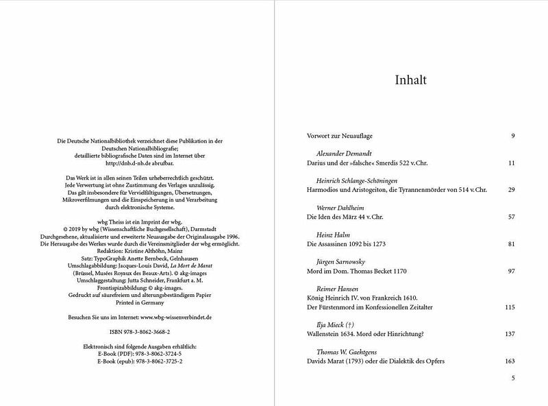 Vorwort zur Neuauflage 9 Alexander Demandt Darius und der »falsche« Smerdis 522 v. Chr. 11 Heinrich Schlange-Schöningen Harmodios und Aristogeiton, die Tyrannenmorder von 514 v. Chr. 29 Werner Dahlheim Die Iden des Marz 44 v. Chr. 57 Heinz Halm Die Assassinen 1092 bis 1273 81 Jürgen Sarnowsky Mord im Dom. Thomas Becket 1170 97 Reimer Hansen Konig Heinrich IV. von Frankreich 1610. Der Furstenmord im Konfessionellen Zeitalter 115 Ilja Mieck ( ) Wallenstein 1634. Mord oder Hinrichtung? 137 Thomas W. Gaehtgens Davids Marat (1793) oder die Dialektik des Opfers 163 Hagen Schulze ( ) Sand, Kotzebue und das Blut des Verraters (1819) 199 Ekkehart Krippendorff ( ) Abraham Lincoln 1865 (mit Reflexion zu Itzhak Rabin, 4. November 1995) 221 Hans-Joachim Torke ( ) Die Narodniki und Zar Alexander II. (1881). Ein Vorspiel zur Revolution 243 Barbara Demandt Das Attentat auf Kaiserin Elisabeth von Osterreich am 10. September 1898 261 Bernd Sösemann Die Bereitschaft zum Krieg: Sarajevo 1914 293 Martin Sabrow Mord und Mythos. Das Komplott gegen Walther Rathenau 1922 325 Sven Felix Kellerhoff Schusse am Ballhausplatz. Der Putsch gegen Osterreichs Kanzler Dollfus 1934 355 Peter Steinbach Der 20. Juli 1944 375 Jürgen Lütt ( ) »The Light has Gone out of our Lives«. Die Ermordung Mahatma Gandhis am 30. Januar 1948 411 Knud Krakau John F. Kennedy: 22. November 1963 429 Armin Fuhrer Viele Spuren ins Nichts: Ali Aca und das Attentat auf Papst Johannes Paul II. 455 Friedemann Büttner ( ) Anwar el-Sadat 1981. Die »Beseitigung des ungerechten Pharao« 471 Sven Felix Kellerhof Ein Anschlag verandert die Welt. Angriff auf Amerika: Protokoll des 11. September 2001 491 Alexander Demandt Das Attentat als Ereignis 511