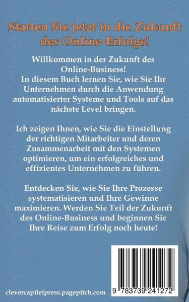 Willkommen in der Zukunft des Online-Business! In diesem Buch lernen Sie, wie Sie Ihr Unternehmen durch die Anwendung automatisierter Systeme und Tools auf das nächste Level bringen. Ich zeigen Ihnen, wie Sie die Einstellung der richtigen Mitarbeiter und deren Zusammenarbeit mit den Systemen optimieren, um ein erfolgreiches und effizientes Unternehmen zu führen. Entdecken Sie, wie Sie Ihre Prozesse systematisieren und Ihre Gewinne maximieren. Werden Sie Teil der Zukunft des Online-Business und beginnen Sie Ihre Reise zum Erfolg noch heute!