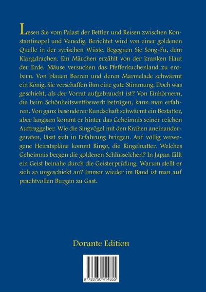 Lesen Sie vom Palast der Bettler und Reisen zwischen Konstantinopel und Venedig. Berichtet wird von einer goldenen Quelle in der syrischen Wüste. Begegnen Sie Song-Fu, dem Klangdrachen. Ein Märchen erzählt von der kranken Haut der Erde. Mäuse versuchen das Pfefferkuchenland zu erobern. Von blauen Beeren und deren Marmelade schwärmt ein König. Sie verschaffen ihm eine gute Stimmung. Doch was geschieht, als der Vorrat aufgebraucht ist? Von Einhörnern, die beim Schönheitswettbewerb betrügen, kann man erfahren. Von ganz besonderer Kundschaft schwärmt ein Bestatter, aber langsam kommt er hinter das Geheimnis seiner reichen Auftraggeber. Wie die Singvögel mit den Krähen aneinandergeraten, lässt sich in Erfahrung bringen. Auf völlig verwegene Heiratspläne kommt Ringo, die Ringelnatter. Welches Geheimnis bergen die goldenen Schlüsselchen? In Japan fällt ein Geist beinahe durch die Geisterprüfung. Warum stellt er sich so ungeschickt an? Immer wieder im Band ist man auf prachtvollen Burgenzu Gast.