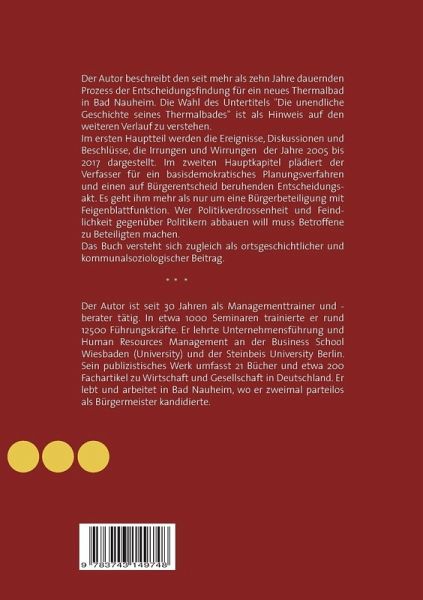 Der Autor beschreibt den seit mehr als zehn Jahren dauernden Prozess der Entscheidungsfindung für ein neues Thermalbad in Bad Nauheim. Die Wahl des Untertitels "Die unendliche Geschichte seines Thermalbades drückt" seine Prognose über den weiteren Verlauf aus. Das Buch versteht sich als ortsgeschichtlicher und kommunalsoziologischer Beitrag. Im ersten Hauptteil werden die Jahre 2005 bis 2017 chronologisch dargestellt. Obwohl er von einem systemischen Versagen aller beteiligten Akteure spricht, meint er die Hauptursache für das "Bad Nauheim Desaster" im Hickhack und Zickzack der fachlich überforderten Ortsparlamentarier zu erkennen.Im zweiten Hauptteil plädiert der Verfasser für ein basisdemokratisches Planungsverfahren und einen auf Bürgerentscheid basierenden Entscheidungsakt. Hierbei orientiert er sich am Modell der "Deliberativen Demokratie" nach Jürgen Habermas und an der Idee des Losverfahrens des belgischen Sozialwissenschaftlers David Van Reybrouck.