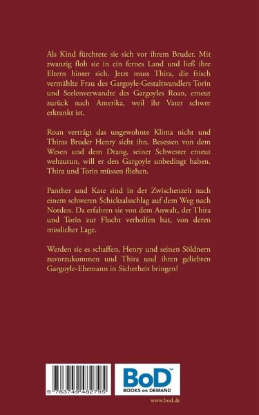 Als Kind fürchtete sie sich vor ihrem Bruder. Mit zwanzig floh sie in ein fernes Land und ließ ihre Eltern hinter sich. Jetzt muss Thira, die frisch vermählte Frau des Gargoyle-Gestaltwandlers Torin und Seelenverwandte des Gargoyles Roan, erneut zurück nach Amerika, weil ihr Vater schwer erkrankt ist.Roan verträgt das ungewohnte Klima nicht und Thiras Bruder Henry sieht ihn. Besessen von dem Wesen und dem Drang, seiner Schwester erneut wehzutun, will er den Gargoyle unbedingt haben. Thira und Torin müssen fliehen.Panther und Kate sind in der Zwischenzeit nach einem schweren Schicksalsschlag auf dem Weg nach Norden. Da erfahren sie von dem Anwalt, der Thira und Torin zur Flucht verholfen hat, von deren misslicher Lage.Werden sie es schaffen, Henry und seinen Söldnern zuvorzukommen und Thira und ihren geliebten Gargoyle-Ehemann in Sicherheit bringen?