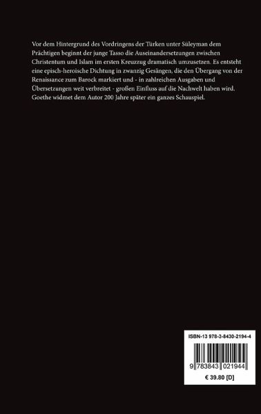 Vor dem Hintergrund des Vordringens der Türken unter Süleyman dem Prächtigen beginnt der junge Tasso die Auseinandersetzungen zwischen Christentum und Islam im ersten Kreuzzug dramatisch umzusetzen. Es entsteht eine episch-heroische Dichtung in zwanzig Gesängen, die den Übergang von der Renaissance zum Barock markiert und - in zahlreichen Ausgaben und Übersetzungen weit verbreitet - großen Einfluss auf die Nachwelt haben wird. Goethe widmet dem Autor 200 Jahre später ein ganzes Schauspiel.