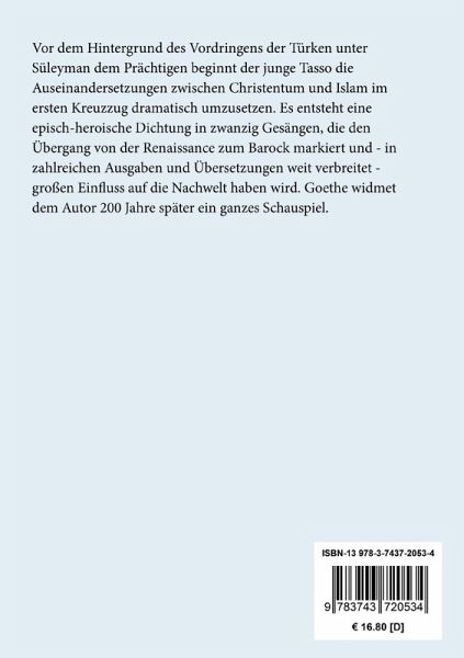 Vor dem Hintergrund des Vordringens der Türken unter Süleyman dem Prächtigen beginnt der junge Tasso die Auseinandersetzungen zwischen Christentum und Islam im ersten Kreuzzug dramatisch umzusetzen. Es entsteht eine episch-heroische Dichtung in zwanzig Gesängen, die den Übergang von der Renaissance zum Barock markiert und - in zahlreichen Ausgaben und Übersetzungen weit verbreitet - großen Einfluss auf die Nachwelt haben wird. Goethe widmet dem Autor 200 Jahre später ein ganzes Schauspiel.