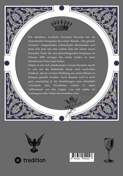 Der attraktive Architekt Giovanni Pezzutto hat die dramatischen Ereignisse des ersten Bandes "Das geniale Versteck" einigermaßen unbeschadet überstanden und freut sich jetzt auf eine schöne Zeit mit seiner neuen Freundin. Doch die sich überschlagenden Ereignisse im Februar 2020 zwingen ihn schon wieder zu einer überstürzten Fahrt nach Italien.Mitten in der sich anbahnenden Corona-Hysterie macht er sich auf die fieberhafte Suche nach wertvollen Schätzen, die im zweiten Weltkrieg aus einem Kloster in Bologna geraubt wurden. Auch diesmal wird er nicht ganz unschuldig in die Ermittlungen eines Mordfalls verwickelt. Sein Privatleben verliert er dabei vollkommen aus den Augen, was sich später als verhängnisvoller Fehler herausstellen wird.