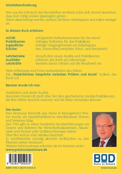 Dieses Buch befasst sich erstmalig umfassend mit den wichtigen ersten Tagen und Wochen im Berufsleben. Insbesondere nach dem Wechsel von der Schule in den Beruf und vermittelt die dort bedeutsamen "dos und taboos". In einem sehr kurzen Zeitraum, unmittelbar nach dem Eintritt in das Berufsleben, wirkt sich das Verhalten der Berufsneulinge entscheidend für deren weitere Zukunft aus. Sie übersehen sehr häufig, dass sich zwei völlig verschiedene Welten, die Schul- und Berufswelt, mit ihren unterschiedlichsten Verhaltens- und Benimmmustern in kürzester Zeit ablösen,und sind sich der drastischen Änderungen nicht bewusst. Deshalb erleben sie unnötige Enttäuschungen und Frustrationen.Teilweise scheitern sie daran. Dieses Buch zeigt in einprägsamer und unterhaltsamer Form, die häufigsten und gravierendsten Fehler während der ersten Zeit im Beruf. Es geht punktgenau auf die geschilderte Situation und Zielgruppe ein und wurde praxisbezogen und verständlich geschrieben. Alle Tipps sind sofort anwendbar, sie verhindern bei ihrer Umsetzung Nachteile und steigern den Sympathiewert ab dem ersten Berufstag. Viele z.T. farbige Fotos veranschaulichen den Inhalt. Mit 14 Selbsttests überprüfen Sie Ihr Wissen. 108 Seiten.