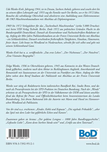 Helga Wanke, 1936 in Oberschlesien geboren, 1945 aus Kattowitz in den Westen Deutschlands geflüchtet, studierte, nach dem Abitur in Recklinghausen, Anglistik, Amerikanistik und Romanistik mit Staatsexamen an der Universität zu Frankfurt am Main. Anfang der 80er Jahre neben dem Beruf weiterbildendes Studium im Rahmen der Publizistik mit Abschluss an der Freien Universität Berlin und dem Akademischen Grad "Licentiata Rerum Publicarum" . Wanke war tätig als Redakteurin beim Italienischen Rundfunk Rai, als Pressereferentin bei der SPD-Bundestagsfraktion und nach der Wende als Pressesprecherin der SPD in der Volkskammer der DDR. Schließlich leitete sie das Referat für Presse- und Öffentlichkeitsarbeit beim Innenministerium des Landes Brandenburg. Seit ihrem Ruhestand lebt Wanke als freie Publizistin in Berlin.