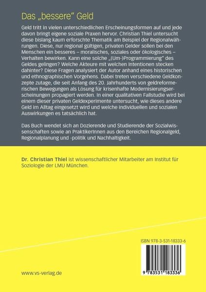 Geld tritt in vielen unterschiedlichen Erscheinungsformen auf und jede davon bringt eigene soziale Praxen hervor. Christian Thiel untersucht diese bislang kaum erforschte Thematik am Beispiel der Regionalwährungen. Diese, nur regional gültigen, privaten Gelder sollen bei den Menschen ein besseres - moralisches, soziales oder ökologisches - Verhalten bewirken. Kann eine solche "(Um-)Programmierung" des Geldes gelingen? Welche Akteure mit welchen Intentionen stecken dahinter? Diese Fragen analysiert der Autor anhand eines historischen und ethnographischen Vorgehens. Dabei treten verschiedene Geldkonzepte zutage, die seit Anfang des 20. Jahrhunderts von geldreformerischen Bewegungen als Lösung für krisenhafte Modernisierungserscheinungen propagiert werden. In einer qualitativen Fallstudie wird bei einem dieser privaten Geldexperimente untersucht, wie dieses andere Geld im Alltag eingesetzt wird und welche individuellen und sozialen Auswirkungen es tatsächlich hat.