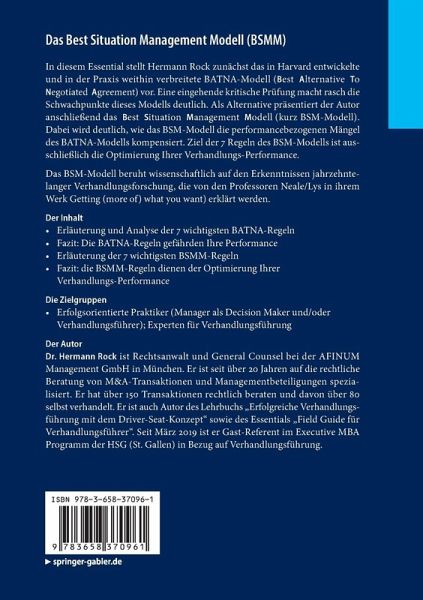 In diesem Essential stellt Hermann Rock zunächst das in Harvard entwickelte und in der Praxis weithin verbreitete BATNA-Modell (Best Alternative To Negotiated Agreement) vor. Eine eingehende kritische Prüfung macht rasch die Schwachpunkte dieses Modells deutlich. Als Alternative präsentiert der Autor anschließend das Best Situation Management Modell (kurz BSM-Modell). Dabei wird deutlich, wie das BSM-Modell die performancebezogenen Mängel des BATNA-Modells kompensiert. Ziel der 7 Regeln des BSM-Modells ist ausschließlich die Optimierung Ihrer Verhandlungs-Performance. Das BSM-Modell beruht wissenschaftlich auf den Erkenntnissen jahrzehntelanger Verhandlungsforschung, die von den Professoren Neale/Lys in ihrem Werk Getting (more of) what you want) erklärt werden.