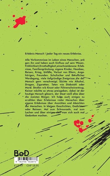Erlebnis Mensch ! Jeder Tag ein neues Erlebniss.Alle Vorkommnisse im Leben eines Menschen, prägen ihn und haben auch Einfluss auf sein Wesen. Fröhlichkeit, Ernsthaftigkeit, einschneidenene Erlebnisse, Familiengründung, eigene Kinder, Hausbau, Reisen, Krieg, Unfälle, Verlust von Eltern, Angehörigen, Freunden. Schulischer und Beruflicher Werdegang, viele tiefgründige Ereignisse die der Mensch gern verschweigt, Süchte wie Alkohol, Drogen, Zigaretten. Taten wie Diebstahl oder Mord. Strafen wie Knast oder Führerscheinentzug. Keiner möchte so etwas preisgeben, dabei ist der heutige Mensch gläsern, der Staat weiß alles über die meisten Bürger. Ich habe auch einiges zu erzählen über Erlebnisse vieler Menschen über eigene Erlebnisse über Ansichten und Absichten der Menschen. In kleinen Geschichten, Gedichten oder Reimen. Mal zum Schmunzeln, mal zum Lachen und über einiges darf man sich auch mal Gedanken machen.