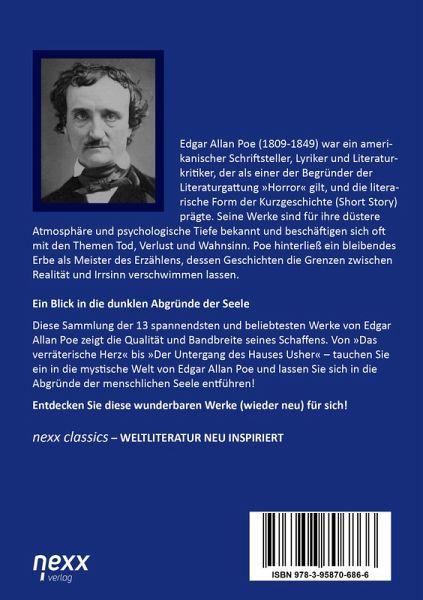 'In der Stunde des Lesens hat der Autor die Seele des Lesers in seiner Gewalt' - Edgar Allen Poe Diese Sammlung der 13 spannendsten und beliebtesten Werke von Edgar Allan Poe zeigt die Qualität und Bandbreite seines Schaffens. Von 'Das verräterische Herz' bis 'Der Untergang des Hauses Usher' - tauchen Sie ein in die mystische Welt von Edgar Allan Poe und lassen Sie sich in die Abgründe der menschlichen Seele entführen! 'Da hörte ich ein leises Ächzen, und ich wusste, das war das Ächzen tödlichen Entsetzens. So stöhnte nicht Schmerz und nicht Kummer - oh nein! Es war das Grauen! Das war der dumpfe, erstickte Laut, der aus den Tiefen der Seele kommt, wenn das Grauen sie gepackt hält. Ich kannte diesen Laut gut. In mancher Nacht, wenn alle Welt schlief, in mancher Mitternacht war er aus meiner eigenen Brust heraufgequollen und hatte mit seinem schrecklichen Klang das Entsetzen, das mich von Sinnen brachte, noch vermehrt.' Aus 'Das verräterische Herz' Entdecken Sie diese wunderbaren Werke (wieder neu) für sich! nexx classics - WELTLITERATUR NEU INSPIRIERT