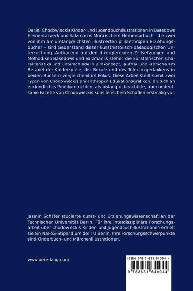Daniel Chodowieckis Kinder- und Jugendbuchillustrationen in Basedows Elementarwerk und Salzmanns Moralischem Elementarbuch - die zwei von ihm am umfangreichsten illustrierten philanthropen Erziehungsbücher - sind Gegenstand dieser kunsthistorisch-pädagogischen Untersuchung. Aufbauend auf den divergierenden Zielsetzungen und Methodiken Basedows und Salzmanns stehen die künstlerischen Charakteristika und Unterschiede in Bildkonzept, -aufbau und -sprache am Beispiel der Kinderspiele, der Berufe und des Toleranzgedankens in beiden Büchern vergleichend im Fokus. Diese Arbeit stellt somit zwei Typen von Chodowieckis philanthropen Edukationsgrafiken, die sich an ein kindliches Publikum richten, als bislang unbeachtete, aber bedeutsame Facette von Chodowieckis künstlerischem Schaffen erstmalig vor.