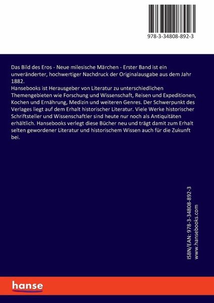 Das Bild des Eros - Neue milesische Märchen - Erster Band ist ein unveränderter, hochwertiger Nachdruck der Originalausgabe aus dem Jahr 1882.Hansebooks ist Herausgeber von Literatur zu unterschiedlichen Themengebieten wie Forschung und Wissenschaft, Reisen und Expeditionen, Kochen und Ernährung, Medizin und weiteren Genres. Der Schwerpunkt des Verlages liegt auf dem Erhalt historischer Literatur. Viele Werke historischer Schriftsteller und Wissenschaftler sind heute nur noch als Antiquitäten erhältlich. Hansebooks verlegt diese Bücher neu und trägt damit zum Erhalt selten gewordener Literatur und historischem Wissen auch für die Zukunft bei.