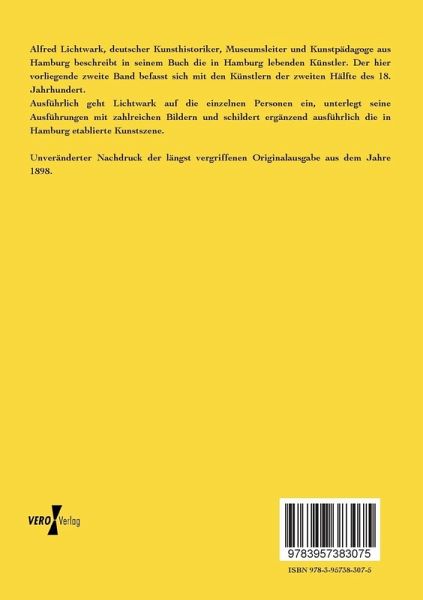 Alfred Lichtwark, deutscher Kunsthistoriker, Museumsleiter und Kunstpädagoge aus Hamburg beschreibt in seinem Buch die in Hamburg lebenden Künstler. Der hier vorliegende zweite Band befasst sich mit den Künstlern der zweiten Hälfte des 18. Jahrhundert.