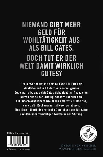 Der Imagewechsel vom skrupellosen Kapitalisten und rücksichtslosen Microsoft-Chef zum wohltätigen Gutmenschen ist Bill Gates mit Bravour gelungen. Eine fundierte kritische Berichterstattung über den vermeintlich größten Philanthropen unserer Zeit und seine Stiftung, die »Bill and Melinda Gates Foundation«, gibt es jedoch nicht. In seinem Enthüllungsbuch räumt der Journalist Tim Schwab mit dem Bild von Bill Gates als Wohltäter auf.