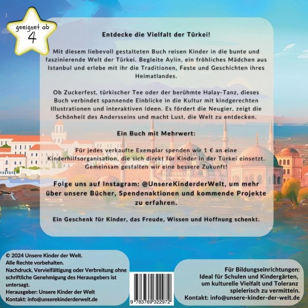 Das bin ich, Mein Zuhause in der Türkei Tauche mit Aylin, einem fröhlichen Mädchen aus Istanbul, in die bunte Welt der Türkei ein. Dieses liebevoll gestaltete Kinderbuch verbindet spannende Geschichten mit interaktiven Elementen. Kinder lernen spielerisch die Traditionen, Feste und die Kultur der Türkei kennen. Von süßem Baklava über den Halay Tanz bis zu beeindruckenden Moscheen, dieses Buch fördert nicht nur die Neugier, sondern auch den interkulturellen Austausch. Für jedes verkaufte Exemplar spenden wir 1 Euro an Kinderhilfsprojekte in der Türkei. Gemeinsam für eine bessere Zukunft!