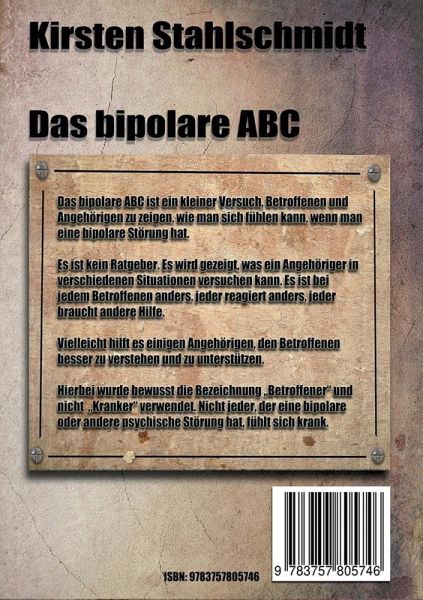 Das bipolare ABC ist ein kleiner Versuch, Betroffenen und Angehörigen zu zeigen, wie man sich fühlen kann, wenn man eine bipolare Störung hat. Es ist kein Ratgeber. Es wird gezeigt, was ein Angehöriger in verschiedenen Situationen versuchen kann. Es ist bei jedem Betroffenen anders, jeder reagiert anders, jeder braucht andere Hilfe. Vielleicht hilft es einigen Angehörigen den Betroffenen besser zu verstehen und kann reagieren. Es wurde bewusst der Betroffene und nicht der Kranke gesagt, nicht jeder, der eine bipolare Störung oder eine andere psychische Störung hat, fühlt sich krank.