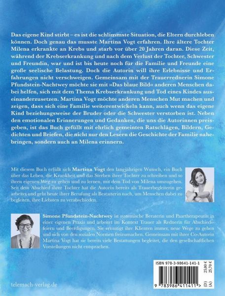 Doch die Autorin will ihre Erlebnisse und Erfahrungen nicht verschweigen. Gemeinsam mit der Trauerrednerin Simone Pfundstein-Nachtwey möchte sie mit »Das blaue Bild« anderen Menschen dabei helfen, sich mit dem Thema Krebserkrankung und Tod eines Kindes auseinanderzusetzen. Martina Vogt möchte anderen Menschen Mut machen und zeigen, dass sich eine Familie weiterentwickeln kann, auch wenn das eigene Kind beziehungsweise der Bruder oder die Schwester verstorben ist.