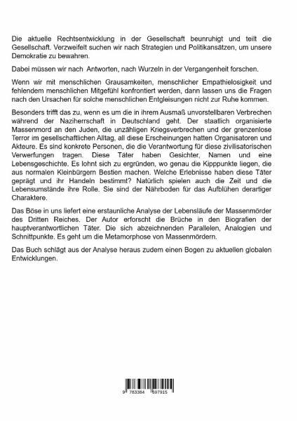 Das vorliegende Buch möchte das Phänomen "Des Bösen in uns" ergründen.Ausgehend von einem philosophischen Exkurs über das Böse wird anhand der Analyse der Lebensläufe der vier NS- Massenmörder Heinrich Himmler, Reinhard Heydrich, Adolf Eichmann und Rudolf Höß heraugestellt, wo die äußeren Triggerpunkte liegen, die das in Jedem angelegte Böse zum Vorschein und zum Ausbruch bringen. Ein gesellschaftliches Umfeld, das durch wirtschaftliche Unsicherheit und soziale Verwerfungen und Konflikte gekennzeichnet ist, erweist sich als besonders geeigneter Nährboden für das Emporkommen rechtsextremer und rassistischer Ansichten und Charaktere. Die Sehnsucht nach einem "Führer" ist typisch für solcherart verfasste Gesellschaften. Das NS-Regime und seine Massenmörder sind zwar typisch und symptomatisch, aber nicht einzigartig in der Geschichte. Die Gefahr der Wiedergeburt des Bösen als herrschende Staatsform besteht permanent, wenn sich die demokratischen gesellschaftlichen Kräfte nicht wirksam dagegenstemmen.