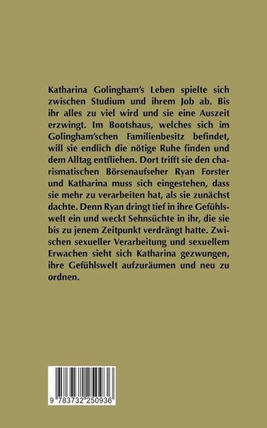 Katharina Golinghams Leben besteht aus ihrem Studium und später aus ihrem Job. Bis ihr alles zu viel wird und sie eine Auszeit erzwingt. Im Bootshaus, das sich im Golingham'schen Familienbesitz befindet, will sie endlich die nötige Ruhe finden und dem Alltag entfliehen. Dort trifft sie den mysteriösen Börsenaufseher Ryan Forster, und Katharina muss sich eingestehen, dass sie mehr zu verarbeiten hat, als sie zunächst gedacht hat. Denn Ryan dringt tief in ihre Gefühlswelt ein und weckt Sehnsüchte in ihr, die sie bis zu diesem Zeitpunkt verdrängt hat. Zwischen sexueller Verarbeitung und sexuellem Erwachen sieht sich Katharina gezwungen, ihre Gefühlswelt aufzuräumen und neu zu ordnen.