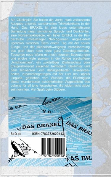 Das BRAXEL ist eine großartige Sammlung nächtlicher Sprech- und Denkfehler, ein Trinkerlexikon, eine Nonsensoklopädie, ein tiefer Einblick in die Kinderstube der unfreiwilligen Neologismen, angesiedelt irgendwo zwischen "Dem ersten Tag mit der neuen Zunge" und der alkoholgeschwängerten Verballhornung des eben noch nicht Zuendegedachten. Tausende neue Worte mit noch neueren Bedeutungen und endlos viele spontan in die Runde erschaffene Amphorismen, ein zukünftiger Zitatenschatz vom Ereignishorizont zwischen dem herrlichen Gelächter und dem schwarzen Loch der Lächerlichkeit, zusammengetragen getrieben von dem Wunsch, die Flüchtigkeit dieser wunderbaren schöpferischen Augenblicke für all jene festzuhalten, die leider nicht dabei sein konnten. Viel Spaß beim Stöbern in dieser vierten, frisch erweiterten Ausgabe des BRAXEL!