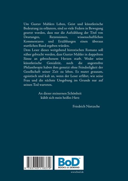 Um Gustav Mahlers Leben, Geist und künstlerische Bedeutung zu erläutern, sind so viele Federn in Bewegung gesetzt worden, dass nur die Aufzählung der Titel von Deutungen, Rezensionen, wissenschaftlichen Kommentaren und Erzählungen einen überaus stattlichen Band ergeben würden.Dem Leser dieses weitgehend historischen Romans soll näher gebracht werden, dass Gustav Mahler in doppeltem Sinne an gebrochenem Herzen starb. Weder seine künstlerische Genialität, noch die angestrebte Philanthropie haben ihm genutzt ohne Feindseligkeit der Gesellschaft seiner Zeit zu leben. Es mutet grausam, egoistisch und kalt an, wenn der Leser erfährt, wie seine Frau und die nächste Umgebung im Grunde nur auf seinen Tod warteten. An dieser steinernen Schönheit kühlt sich mein heißes Herz Friedrich Nietzsche