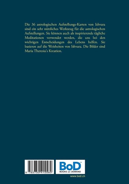 Die 36 astrologischen Aufstellungs-Karten von Ishvara sind ein sehr nützliches Werkzeug für die astrologischen Aufstellungen. Sie können auch als inspirierende tägliche Meditationen verwendet werden, die uns bei den wichtigen Entscheidungen des Lebens helfen. Sie basieren auf die Weisheiten von Ishvara. Die Bilder sind Maria Theresia's Kreation.