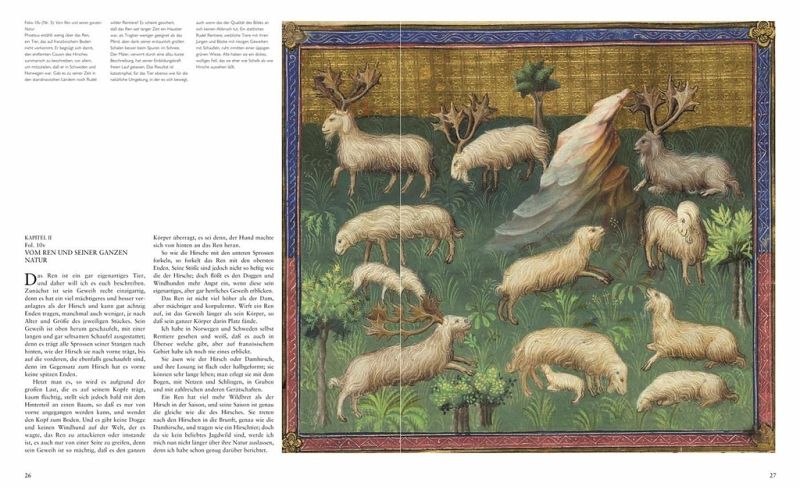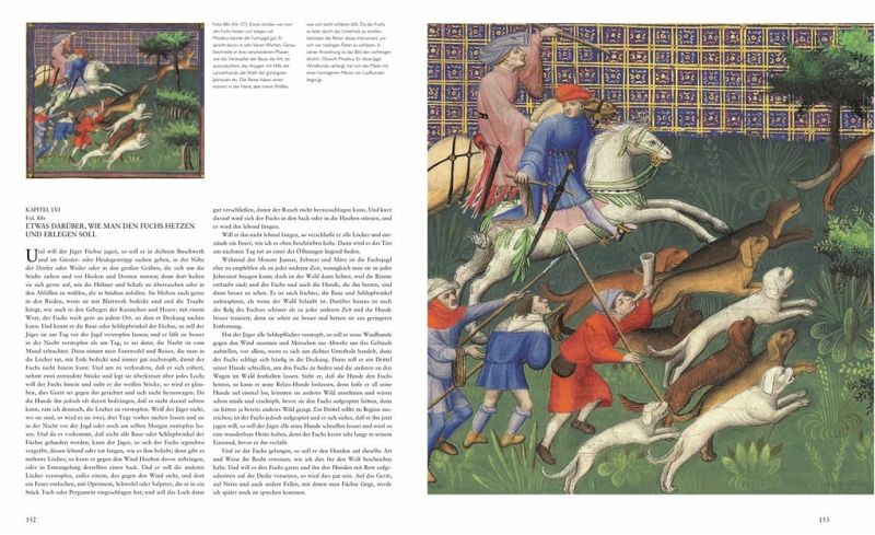 Glänzendes Gold und leuchtende Farben lassen die Miniaturmalereien im "Buch der Jagd" in intensiven Farben leuchten. Die illuminierte Handschrift zeugt vom überragenden Niveau der französischen Buchkunst. Beim Betrachten fühlt man sich mitten in das geschäftige Treiben einer mittelalterlichen Jagdgesellschaft versetzt und kann nur staunen über die kenntnisvolle Darstellung der Tierwelt.