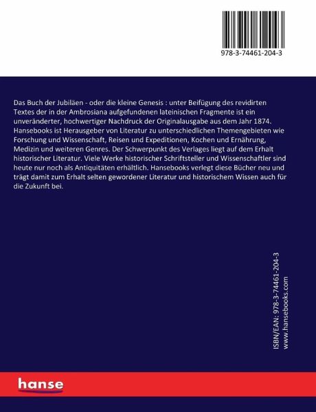Das Buch der Jubiläen - oder die kleine Genesis : unter Beifügung des revidirten Textes der in der Ambrosiana aufgefundenen lateinischen Fragmente ist ein unveränderter, hochwertiger Nachdruck der Originalausgabe aus dem Jahr 1874.