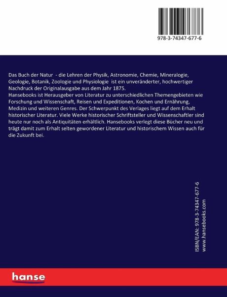 Das Buch der Natur - die Lehren der Physik, Astronomie, Chemie, Mineralogie, Geologie, Botanik, Zoologie und Physiologie ist ein unveränderter, hochwertiger Nachdruck der Originalausgabe aus dem Jahr 1875.Hansebooks ist Herausgeber von Literatur zu unterschiedlichen Themengebieten wie Forschung und Wissenschaft, Reisen und Expeditionen, Kochen und Ernährung, Medizin und weiteren Genres. Der Schwerpunkt des Verlages liegt auf dem Erhalt historischer Literatur. Viele Werke historischer Schriftsteller und Wissenschaftler sind heute nur noch als Antiquitäten erhältlich. Hansebooks verlegt diese Bücher neu und trägt damit zum Erhalt selten gewordener Literatur und historischem Wissen auch für die Zukunft bei.