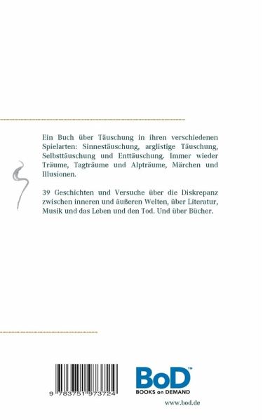 Ein Buch über Täuschung in ihren verschiedenen Spielarten: Sinnestäuschung, arglistige Täuschung, Selbsttäuschung und Enttäuschung. Immer wieder Träume, Tagträume und Alpträume, Märchen und Illusionen.39 Geschichten und Versuche über die Diskrepanz zwischen inneren und äußeren Welten, über Literatur, Musik und das Leben und den Tod. Und über Bücher.