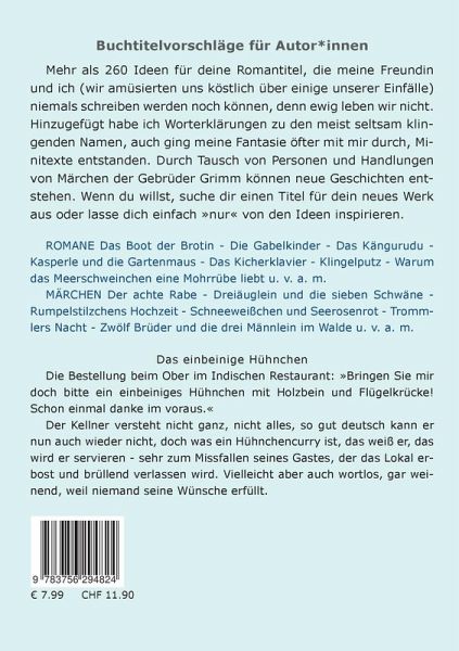 Mehr als 260 Ideen für deine Romantitel, die meine Freundin und ich (wir amüsierten uns köstlich über einige unserer Einfälle) niemals schreiben werden noch können, denn ewig leben wir nicht. Hinzugefügt habe ich Worterklärungen zu den meist seltsam klingenden Namen, auch ging meine Fantasie öfter mit mir durch, Minitexte entstanden. Durch Tausch von Personen und Handlungen von Märchen der Gebrüder Grimm können neue Geschichten entstehen. Wenn du willst, suche dir einen Titel für dein neues Werk aus oder lasse dich einfach »nur« von den Ideen inspirieren.