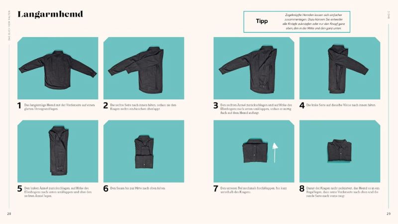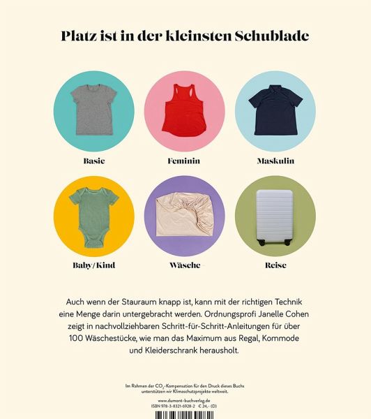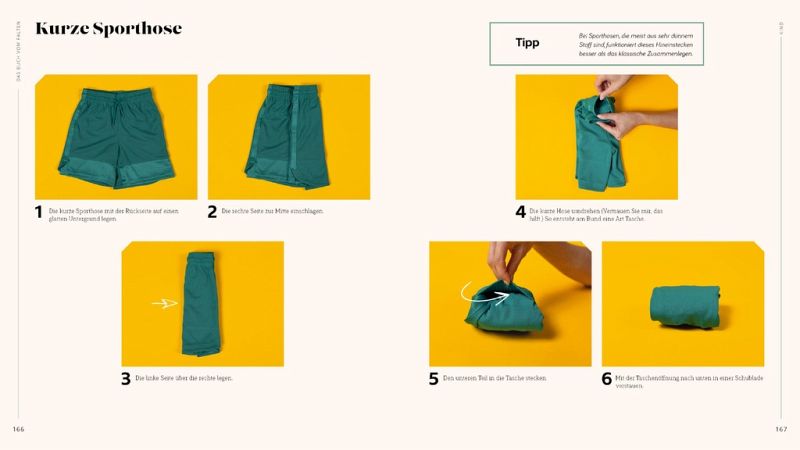 Blazer, Bikini, Bademantel. Schlips, Shorts, Spannbettlaken. Pyjama, Poloshirt, Pullover - die Liste der täglich zu verstauenden Dinge ist nahezu endlos. Für all die, die sich eine angenehme, leicht aufrechtzuerhaltende Ordnung und auch mehr Platz im Kleiderschrank wünschen, liefert Janelle Cohen in ihrem Buch vom Falten detaillierte Schritt-für-Schritt-Anleitungen für jedes erdenkliche Wäschestück. Sie zeigt, wie man knitterfrei die Koffer packt, den Überblick über die Kinderklamotten behält, sehr viele Sachen in wenig Raum unterbringt und gibt Tipps, wie man Ballast im Kleiderschrank loswird. Das Falten von Textilien ist der einfachste und schnellste Weg, um Platz zu sparen, attraktive Schubladen und Regale zu schaffen und Hab und Gut zu ordnen. Und das Beste: Bügeln wird überflüssig.
