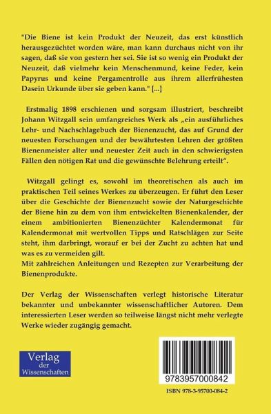 Erstmalig 1898 erschienen und sorgsam illustriert, beschreibt Johann Witzgall sein umfangreiches Werk als ein ausführliches Lehr- und Nachschlagebuch der Bienenzucht, das auf Grund der neuesten Forschungen und der bewährtesten Lehren der größten Bienenmeister alter und neuester Zeit auch in den schwierigsten Fällen den nötigen Rat und die gewünschte Belehrung erteilt .
