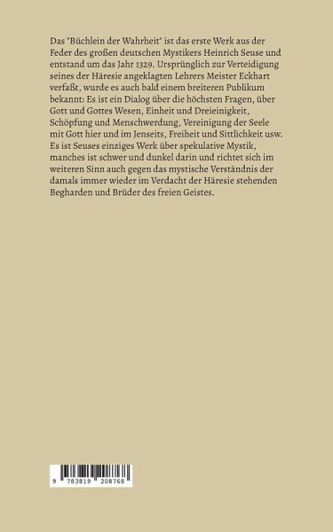 Das "Büchlein der Wahrheit" ist das erste Werk aus der Feder des großen deutschen Mystikers Heinrich Seuse und entstand um das Jahr 1329. Ursprünglich zur Verteidigung seines der Häresie angeklagten Lehrers Meister Eckhart verfaßt, wurde es auch bald einem breiteren Publikum bekannt: Es ist ein Dialog über die höchsten Fragen, über Gott und Gottes Wesen, Einheit und Dreieinigkeit, Schöpfung und Menschwerdung, Vereinigung der Seele mit Gott hier und im Jenseits, Freiheit und Sittlichkeit usw. Es ist Seuses einziges Werk über spekulative Mystik, manches ist schwer und dunkel darin und richtet sich im weiteren Sinn auch gegen das mystische Verständnis der damals immer wieder im Verdacht der Häresie stehenden Begharden und Brüder des freien Geistes.