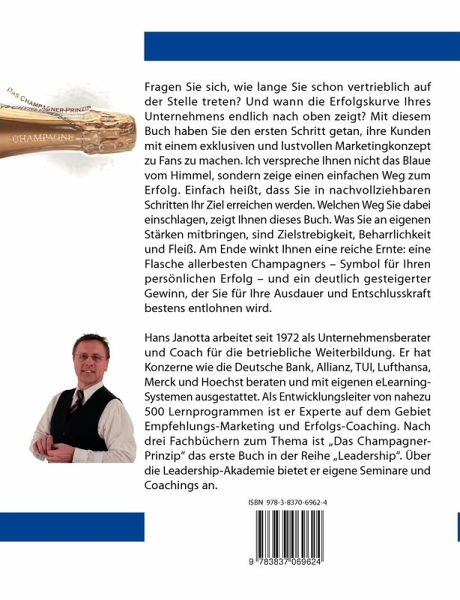 Fragen Sie sich, wie lange Sie schon vertrieblich auf der Stelle treten? Und wann die Erfolgskurve Ihres Unternehmens endlich nach oben zeigt? Mit diesem Buch haben Sie den ersten Schritt getan, ihre Kunden mit einem exklusiven und lustvollen Marketingkonzept zu Fans zu machen. Ich verspreche Ihnen nicht das Blaue vom Himmel, sondern zeige einen einfachen Weg zum Erfolg. Einfach heißt, dass Sie in nachvollziehbaren Schritten Ihr Ziel erreichen werden. Welchen Weg Sie dabei einschlagen, zeigt Ihnen dieses Buch. Was Sie an eigenen Stärken mitbringen, sind Zielstrebigkeit, Beharrlichkeit und Fleiß. Am Ende winkt Ihnen eine reiche Ernte: eine Flasche allerbesten Champagners - Symbol für Ihren persönlichen Erfolg - und ein deutlich gesteigerter Gewinn, der Sie für Ihre Ausdauer und Entschlusskraft bestens entlohnen wird.
