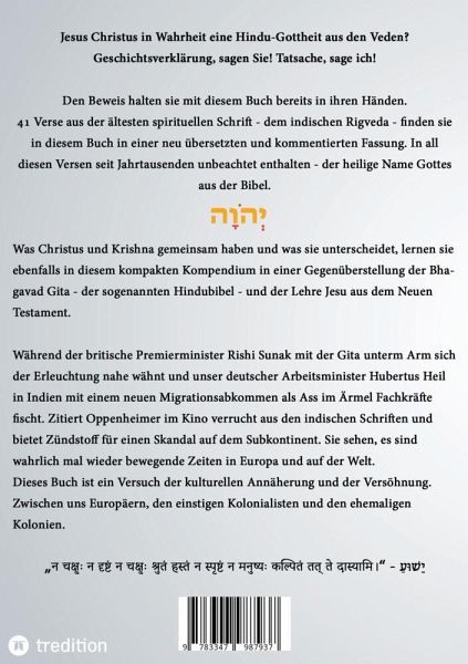 Jesus Christus in Wahrheit eine Hindu-Gottheit aus den Veden?Geschichtsverklärung, sagen Sie! Tatsache, sage ich! Den Beweis halten sie mit diesem Buch bereits in ihren Händen.41 Verse aus der ältesten spirituellen Schrift - dem indischen Rigveda - finden sie in diesem Buch in einer neu übersetzten und kommentierten Fassung. In all diesen Versen seit Jahrtausenden unbeachtet enthalten - der heilige Name Gottes aus der Bibel. Was Christus und Krishna gemeinsam haben und was sie unterscheidet, lernen sie ebenfalls in diesem kompakten Kompendium in einer Gegenüberstellung der Bhagavad Gita - der sogenannten Hindubibel - und der Lehre Jesu aus dem Neuen Testament.Während der britische Premierminister Rishi Sunak mit der Gita unterm Arm sich der Erleuchtung nahe wähnt und unser deutscher Arbeitsminister Hubertus Heil in Indien mit einem neuen Migrationsabkommen als Ass im Ärmel Fachkräfte fischt. Zitiert Oppenheimer im Kino verrucht aus den indischen Schriften und bietet Zündstoff für einen Skandal auf dem Subkontinent. Sie sehen, es sind wahrlich mal wieder bewegende Zeiten in Europa und auf der Welt.Dieses Buch ist ein Versuch der kulturellen Annäherung und der Versöhnung. Zwischen uns Europäern, den einstigen Kolonialisten und den ehemaligen Kolonien." " -