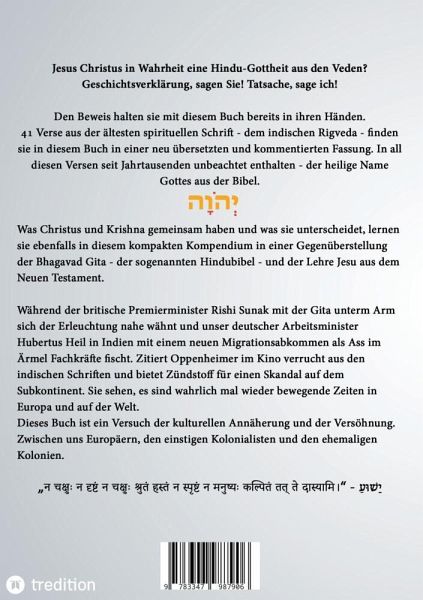 Jesus Christus in Wahrheit eine Hindu-Gottheit aus den Veden?Geschichtsverklärung, sagen Sie! Tatsache, sage ich! Den Beweis halten sie mit diesem Buch bereits in ihren Händen.41 Verse aus der ältesten spirituellen Schrift - dem indischen Rigveda - finden sie in diesem Buch in einer neu übersetzten und kommentierten Fassung. In all diesen Versen seit Jahrtausenden unbeachtet enthalten - der heilige Name Gottes aus der Bibel. Was Christus und Krishna gemeinsam haben und was sie unterscheidet, lernen sie ebenfalls in diesem kompakten Kompendium in einer Gegenüberstellung der Bhagavad Gita - der sogenannten Hindubibel - und der Lehre Jesu aus dem Neuen Testament.Während der britische Premierminister Rishi Sunak mit der Gita unterm Arm sich der Erleuchtung nahe wähnt und unser deutscher Arbeitsminister Hubertus Heil in Indien mit einem neuen Migrationsabkommen als Ass im Ärmel Fachkräfte fischt. Zitiert Oppenheimer im Kino verrucht aus den indischen Schriften und bietet Zündstoff für einen Skandal auf dem Subkontinent. Sie sehen, es sind wahrlich mal wieder bewegende Zeiten in Europa und auf der Welt.Dieses Buch ist ein Versuch der kulturellen Annäherung und der Versöhnung. Zwischen uns Europäern, den einstigen Kolonialisten und den ehemaligen Kolonien." " -