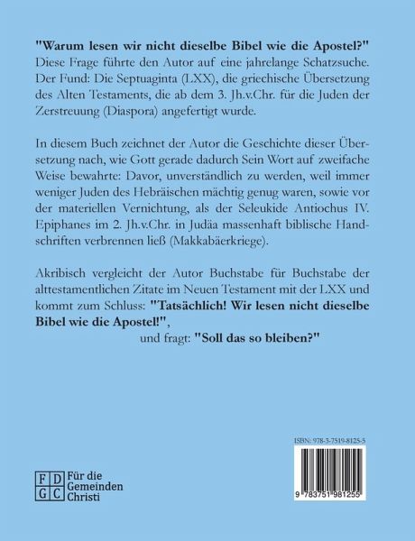 "Warum lesen wir nicht dieselbe Bibel wie die Apostel?" Diese Frage führte den Autor auf eine jahrelange Schatzsuche. Der Fund: Die Septuaginta (LXX), die griechische Übersetzung des Alten Testaments, die ab dem 3. Jh. v.Chr. für die Juden der Zerstreuung angefertigt wurde.In diesem Buch zeichnet der Autor die Geschichte dieser Übersetzung nach, wie Gott gerade dadurch Sein Wort auf zweifache Weise bewahrte: Davor, unverständlich zu werden, weil immer weniger Juden des Hebräischen mächtig genug waren, sowie vor der materiiellen Vernichtung, als der Seleukide Antiochus IV im 2. Jh. v.Chr. massenhaft biblische Handschriften verbrennen ließ.Akribisch vergleicht der Autor Buchstabe für Buchstabe der alttestamentlichen Zitate im Neuen Testament mit der LXX und kommt zum Schluss: "Tatsächlich! Wir lesen nicht dieselbe Bibel wie die Apostel!", und fragt: "Soll das so bleiben?"