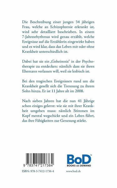 Die Beischreibung einer jungen 34 jährigen Frau, welche an Schizophrenie erkrankt ist, wird sehr detailliert beschrieben. In einem 7-Jahresrhythmus wird genau erzählt, welche Ereignisse auf die Erzählerin eingewirkt haben und es wird klar, dass das Leben mit oder ohne Krankheit unterschiedlich ist. Dabei hat sie ein "Geheimnis" in der Psychotherapie zu entdecken: nämlich dass sie ihren Ehemann verlassen will, weil sie lesbisch ist. Bei den tragischen Ereignissen rund um die Krankheit gesellt sich die Trennung zu ihrem Sohn hinzu. Er ist 11 Jahre alt im 2008.Nach sieben Jahren hat die nun 41 Jährige schon einiges gelernt: wie sie mit ihrer Krankheit umgehen muss: nämlich Stimmen im Kopf mental wegschickt und ein Leben führen, das ihre Fähigkeiten zur Genesung stärkt.
