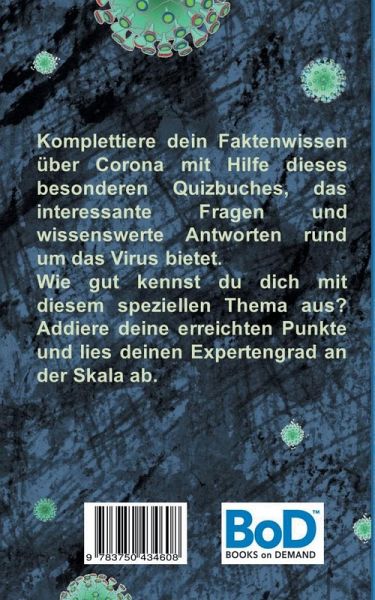 Komplettiere dein Faktenwissen über Corona mit Hilfe dieses besonderen Quizbuches, das interessante Fragen und wissenswerte Antworten rund um das Virus bietet. Wie gut kennst du dich mit diesem speziellen Thema aus? Addiere deine erreichten Punkte und lies deinen Expertengrad an der Skala ab. Weitere Bücher zum Thema Corona von Brian Gagg:0. Das Corona Ausmalbuch - Malbuch zur Entspannung1. Corona Witze und Sprüche - Humor gegen das Virus!2. Corona geht viral! Das Corona Witzebuch3. Das Corona Wortesuchrätselbuch. Fakten über Corona & Co4. Gruß aus der Quarantäne! Das Corona Postkartenbuch5. Corona Notizbuch6. FCK CRN Notizbuch7. Corona Lisa Notizbuch8. Corona? Hab ich schon! Notizbuch