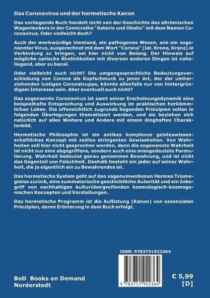 Das Coronavirus und der hermetische KanonDas vorliegende Buch handelt nicht von der Geschichte des altrömischen Wagenlenkers in der Comicreihe "Asterix und Obelix" mit dem Namen Coronavirus. Oder vielleicht doch? Auch der merkwürdige Umstand, ein pathogenes Wesen, wie ein sogenannter Virus, ausgerechnet mit dem Wort "Corona" (lat. Krone, Kranz) in Verbindung zu bringen, sei hier nicht von Belang. Der Hinweis auf mögliche optische Ähnlichkeiten mit diversen anderen Dingen ist nahe-liegend, aber zu banal.Oder vielleicht auch nicht? Die umgangssprachliche Bedeutungsverschiebung von Corona als Kopfschmuck zu jener Art, der der umherziehenden lustigen Coronatruppe, könnte allenfalls nur von hintergründigem Interesse sein. Aber eventuell auch nicht?Das sogenannte Coronavirus ist samt seiner Erscheinungsdynamik eine beispielhafte Entsprechung und Auswirkung im praktischen herkömmlichen Leben. Die offensichtlich zugrunde liegenden Prinzipien sollen in folgenden Überlegungen thematisiert werden, und sie beziehen sich natürlich auf alles Weitere und Andere mit einem dinghaften Charakterbild.Hermetische Philosophie ist ein antikes komplexes geisteswissenschaftliches Konzept mit zeitlos stringenten Gewissheiten. Von Wahrheiten soll hier nicht gesprochen werden, denn die sogenannte Wahrheit ist nicht nur eine abgegriffene, sondern auch eine missgedeutete Formulierung. Wahrheit bedeutet genau genommen Bewahrung, und ist nicht das Gegenteil von Falschheit. Deshalb besteht ein jeder auf seiner Wahrheit, die ja eigentlich ein zu Bewahrendes ist.Das hermetische System geht auf den sagenumwobenen Hermes Trismegistos zurück, eine summatorische geschichtliche Autorität und ein Inbegriff von nachhaltigen kulturübergreifenden kosmologisch-kosmogonischen Konzepten und Vorstellungen.Das hermetische Programm ist die Auflistung (Kanon) von essenzialen Prinzipien, deren Erörterung in dem Buch erfolgt.Keywords: Corona. Virus. Hermetik. Hermes Trismegistos. Uroboros. Titel: Das Coronavirus und der hermetische Kanon. Autor: Dr. Klaus Rosenlöcher. Herstellung und Verlag: Books on Demand, Norderstedt, ISBN: 9783751922364, Paperback, 28 Seiten, s/w, 21,0 x 14,8 cm, Euro 5,99 [D]