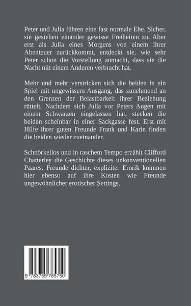 Peter und Julia führen eine fast normale Ehe. Sicher, sie gestehen einander gewisse Freiheiten zu. Aber erst als Julia eines Morgens von einem ihrer Abenteuer zurückkommt, entdeckt sie, wie sehr Peter schon die Vorstellung anmacht, dass sie die Nacht mit einem Anderen verbracht hat.Mehr und mehr verstricken sich die beiden in ein Spiel mit ungewissem Ausgang, das zunehmend an den Grenzen der Belastbarkeit ihrer Beziehung rüttelt. Nachdem sich Julia vor Peters Augen mit einem Schwarzen eingelassen hat, stecken die beiden scheinbar in einer Sackgasse fest. Erst mit Hilfe ihrer guten Freunde Frank und Karin finden die beiden wieder zueinander.Schnörkellos und in raschem Tempo erzählt Clifford Chatterley die Geschichte dieses unkonventionellen Paares. Freunde dichter, expliziter Erotik kommen hier ebenso auf ihre Kosten wie Freunde ungewöhnlicher erotischer Settings.