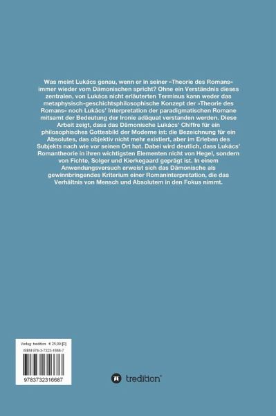 Was meint Lukács genau, wenn er in seiner "Theorie des Romans" immer wieder vom Dämonischen spricht? Ohne ein Verständnis dieses zentralen, von Lukács nicht erläuterten Terminus kann weder das metaphysisch-geschichtsphilosophische Konzept der "Theorie des Romans" noch Lukács Interpretation der paradigmatischen Romane mitsamt der Bedeutung der Ironie adäquat verstanden werden. Diese Arbeit zeigt, dass das Dämonische Lukács Chiffre für ein philosophisches Gottesbild der Moderne ist: die Bezeichnung für ein Absolutes, das objektiv nicht mehr existiert, aber im Denken und Erleben des Subjekts nach wie vor seinen Ort hat. Dabei wird deutlich, dass Lukács Romantheorie in ihren wichtigsten Elementen nicht von Hegel, sondern von Fichte, Solger und Kierkegaard geprägt ist. In einem Anwendungsversuch erweist sich das Dämonische als gewinnbringendes Kriterium einer Romaninterpretation, die das Verhältnis von Mensch und Absolutem in den Fokus nimmt.