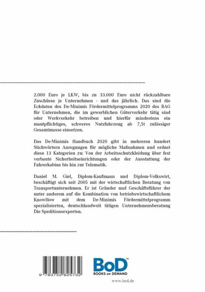 Hunderte exemplarische Maßnahmen für die De-Minimis Förderperiode 2020, thematisch sortiert von Arbeitsschutzkleidung über Maßnahmen in der Fahrerkabine bis zu Telematik. Plus Fördermittelratgeber Reifenkauf.Für Speditionen und alle Unternehmen mit schweren Nutzfahrzeugen, die das Fördermittelprogramm des BAG in 2020 nutzen wollen.