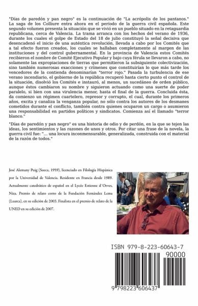 "Días de paredón y pan negro" es la continuación de "La acrópolis de los pantanos." La saga de los Colliure entra ahora en el período de la guerra civil española. Este segundo volumen presenta la situación que se vivió en un pueblo situado en la retaguardia republicana, cerca de Valencia. La trama arranca con los hechos del verano de 1936, durante los cuales el golpe de Estado del 18 de julio constituyó la señal decisiva que desencadenó el inicio de una auténtica revolución, llevada a cabo por los Comités que a tal efecto fueron creados, los cuales se hallaban completamente al margen de las instituciones y del control gubernamental. En la provincia de Valencia estos Comités recibieron el nombre de Comité Ejecutivo Popular y bajo cuya férula se llevaron a cabo, no solamente las expropiaciones de tierras que permitieron la subsiguiente colectivización, sino también numerosas exacciones y crímenes que constituirían lo que más tarde los vencedores de la contienda denominarían "terror rojo." Pasada la turbulencia de ese verano incendiario, el gobierno de la república recuperó hasta cierto punto el control de la situación, disolvió los Comités e instauró, al menos, un sucedáneo de orden público, aunque éstos cambiaron su nombre y siguieron actuando como una suerte de poder paralelo, si bien con una virulencia menor, hasta el final de la guerra. Concluida ésta, da comienzo un régimen cuartelero, represor y corrupto, el cual, durante los primeros años, excita y canaliza la venganza popular, no sólo contra los autores de los desmanes cometidos durante el conflicto, también contra quienes ocuparon un cargo o asumieron una responsabilidad en partidos políticos y sindicatos. Comienza así el llamado "terror blanco." "Días de paredón y pan negro" es una historia de odio y de perdón, en la que se tejen las ideas, los sentimientos y las razones de unos y otros. Por citar una frase de la novela, la guerra civil fue: "… una locura inconmensurable, generalizada, construida con el material de la razón de todos."