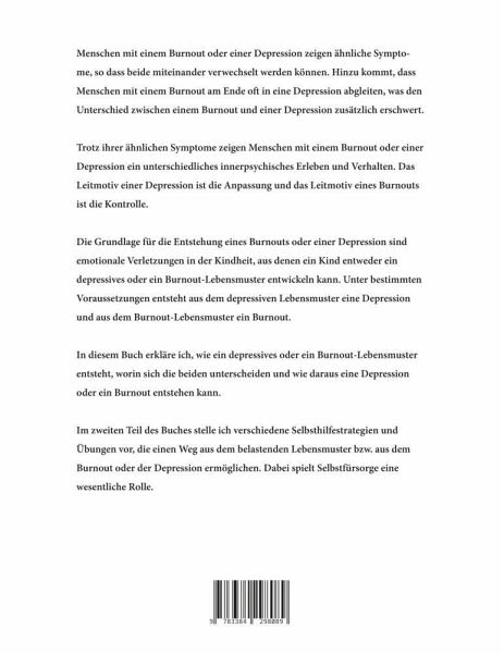 Menschen mit einem Burnout oder einer Depression zeigen ähnliche Symptome, so dass beide miteinander verwechselt werden können. Hinzu kommt, dass Menschen mit einem Burnout am Ende oft in eine Depression abgleiten, was den Unterschied zwischen einem Burnout und einer Depression zusätzlich erschwert.Trotz ihrer ähnlichen Symptome zeigen Menschen mit einem Burnout oder einer Depression ein unterschiedliches innerpsychisches Erleben und Verhalten. Das Leitmotiv einer Depression ist die Anpassung und das Leitmotiv eines Burnouts ist die Kontrolle.Die Grundlage für die Entstehung eines Burnouts oder einer Depression sind emotionale Verletzungen in der Kindheit, aus denen ein Kind entweder ein depressives oder ein Burnout-Lebensmuster entwickeln kann. Unter bestimmten Voraussetzungen entsteht aus dem depressiven Lebensmuster eine Depression und aus dem Burnout-Lebensmuster ein Burnout.Die Grundlage für die Entstehung eines Burnouts oder einer Depression sind emotionale Verletzungen in der Kindheit, aus denen ein Kind entweder ein depressives oder ein Burnout-Lebensmuster entwickeln kann. Unter bestimmten Voraussetzungen entsteht aus dem depressiven Lebensmuster eine Depression und aus dem Burnout-Lebensmuster ein Burnout.In diesem Buch erkläre ich, wie ein depressives bzw. ein Burnout-Lebensmuster entsteht, worin sich die beiden unterscheiden und wie daraus eine Depression oder ein Burnout entstehen kann.Im zweiten Teil des Buches stelle ich dir verschiedene Selbsthilfestrategien und Übungen vor, die dir einen Weg aus deinem belastenden Lebensmuster bzw. aus deinem Burnout oder deiner Depression ermöglichen. Dabei spielt Selbstfürsorge eine wesentliche Rolle.
